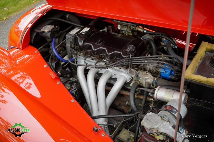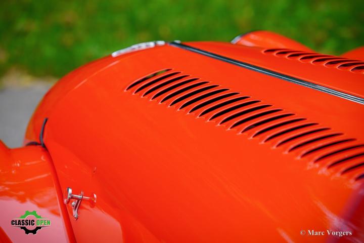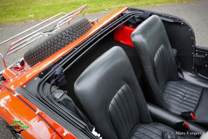 Uitgevoerd in opvallend rood met een zwart interieur en zwarte vinyl soft-top.