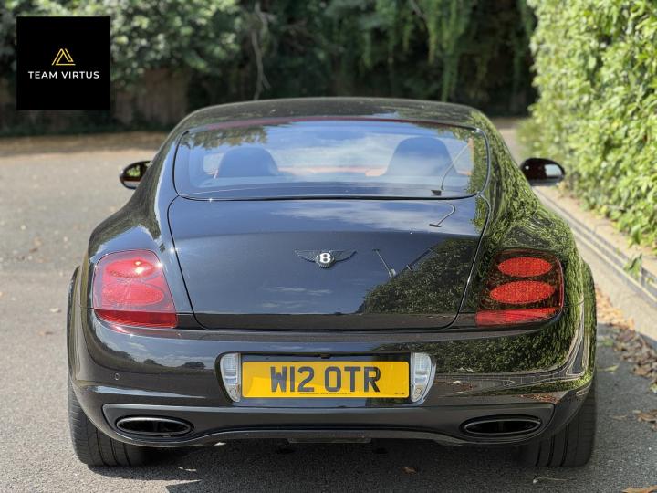 Unveiled in 2003 at the Geneva Motor Show, the Continental GT was a different animal. The Crewe-built cars numbers were impressive with the twin-turbo, VAG 6.0 litre W12 engines, developed in the VW Phaeton and stillborn W12 sports car, producing 552bhp and 479lb ft torque. This prodigious output was fed through a six-speed automatic box from the new A8 and distributed by the Quattro four-wheel drive system. 0-60 in 4.7 seconds and a top speed of 196mph were significant for a car of this stature. Some six years later, also in Geneva, Bentley unveiled their new 621bhp Continental Supersports which was indecently quick with 0-60mph in 3.7 seconds and a top speed of 204 mph, making it the fastest and the most powerful production Bentley ever. With a revised 'Tiptronic' automatic gearbox employing a 'quick-shift' system, gear change times were reduced by 50%. In order to cope with the increased power, it was necessary to have carbon fibre reinforced silicon carbide ceramic disc brakes - the largest and most powerful brakes ever fitted to a production car. As the Supersports evolved Bentley managed to accidentally create a very limited-edition car, the two seat examples were not selling as hoped because at the time most of the Bentley ownership comprised a demographic of drivers who wanted four seats and a softer ride. Enter the SuperSport ‘comfort seat’ option, a four-seat option that still gave performance, clearly not that of the two-seater but it gave a very clean way for Bentley to exit what appeared to be a fabulous car but not for their then customer demographic, thus leaving those with the full two-seat example with a low production car and now highly desirable. This stunning low mileage Bentley Continental Supersports is a 2010, UK supplied, right hand drive example finished in metallic Onyx Black with Beluga and Newmarket tan leather trim. Presented with a pair of heated, two-piece, carbon fibre sports seats and Breitling analogue clock sitting above the £5,000 uprated NAIM premium satellite navigation by Bentley Bristol. Upgrades by Bentley have not stopped there, originally a Bentley Pangbourne demonstrator car, as many options as possible were specified including a Bentley warrantied and fitted Acropovic exhaust system which was circa £7,000 alone and added between 7-12bhp along with an uprated leather steering wheel. Where rear passengers would normally reside, a carbon fibre cross-brace spans the cabin, generating torsional rigidity, showing the real intent of the 'Supersports', this is a rarity now as many cars were converted by Bentley to four seat cars to help sales. Sitting on 20" alloy wheels, the car is fitted with carbon-ceramic brakes, adjustable suspension and a host of other options making it, effectively, a very luxurious 'Group A Touring Car' for the road with incredible power. Serviced at 98, 344, 2550, 3559, 4592, 5079, 5992, 7402, 11745, 13567, 16702, 18473, 20713 and 21399 – boasting an all-Bentley main dealer history, the latest the larger of the scheduled carried out in February 2024. Supplied with its driver's manuals, spare keys, service book and a UK V5C registration document,this fantastically quick car would put a smile on any driver's face. We welcome any inspection of this amazing, showroom condition, Bentley with the W12 cherished plate included in the sale.