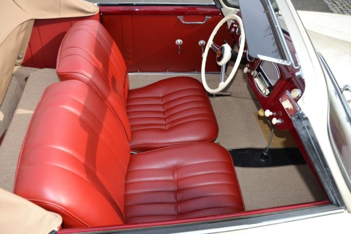 Zeldzame pre-A Knickscheibe van Porsche, een van de slechts circa 1.300 gefabriceerde cabriolets, prachtig gerestaureerd en in een bijzondere en originele kleurencombinatie. Het Sandgrau met het rode lederen interieur en de lichtbruine kap geven de auto een mooie jarenvijftiguitstraling. Dit is een van de laatste Knickscheibe cabriolets zonder de claxonroostertjes, wat deze Porsche krachtig in zijn eenvoud maakt en daardoor erg begeerd.